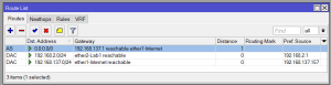 Lakukan pengaturan IP Gateway, masuk pada menu IP->Routes , tambahkan IP Gateway (disesuikan dengan gateway pada jaringan anda)Pengaturan IP Gateway pada mikrotik
